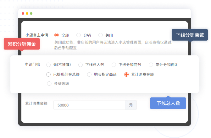 可设置达到下线总人数/下线分销商数/累计分销佣金/已提现佣金总额/购买指定商品/累计消费金额/会员等级等门槛,达到门槛的用户可以自动或申请成为店长。