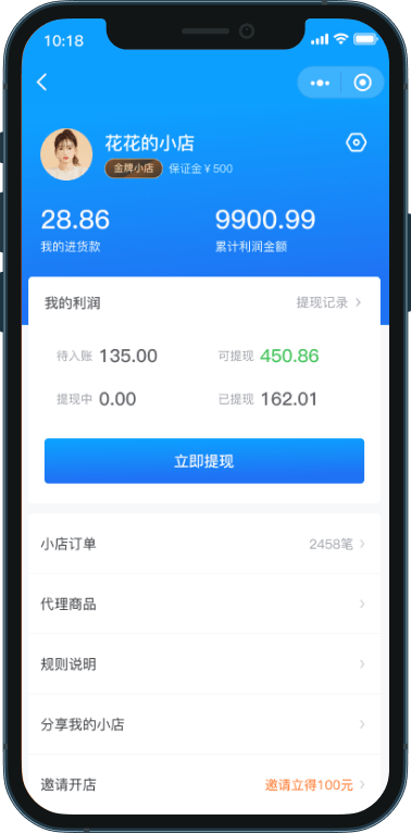 小店须充值进货款模拟线上虚拟库存,每出售一件商品,则扣除对应代理金额的进货款,订单实付款(不含运费)即为其所获利润。