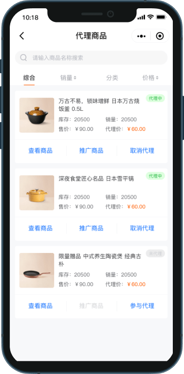 可在代理小店体系下配置各商品的代理状态和代理价格,店长从主商城中获取可代理的商品。