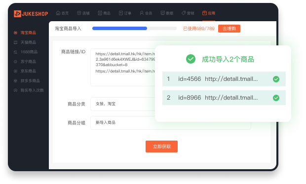 目前可支持淘宝、天猫、1688、京东、拼多多、苏宁六大电商平台内的商品导入。