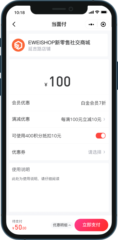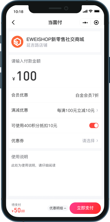 支持会员等级折扣、会员卡折扣、满减优惠、积分抵扣、优惠券、消费奖励等优惠叠加使用。