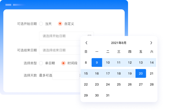 支持通过日历选择一段时间,目前天数的计算方式有2种:当天/跨天。当天模式即1号-7号等于7天,跨天模式即1号-7号等于6天。